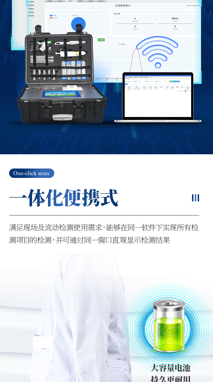 6、一體化便攜式快檢設備,滿足現場及流動檢測使用需求,能夠在同一軟件下實現所有檢測項目的檢測,并可通過同一窗口直觀顯示檢測結果。