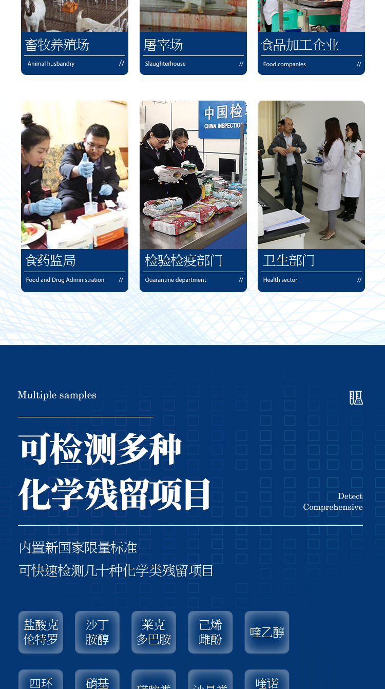 該氯霉素快速檢測系統設備為集成化食品安全快速檢測分析設備,廣泛應用于養殖場、屠宰場、食品肉產品深加工企業、檢驗檢疫部門、食藥監局、衛生部門、高教院校、科研院所、農業部門等單位使用。
