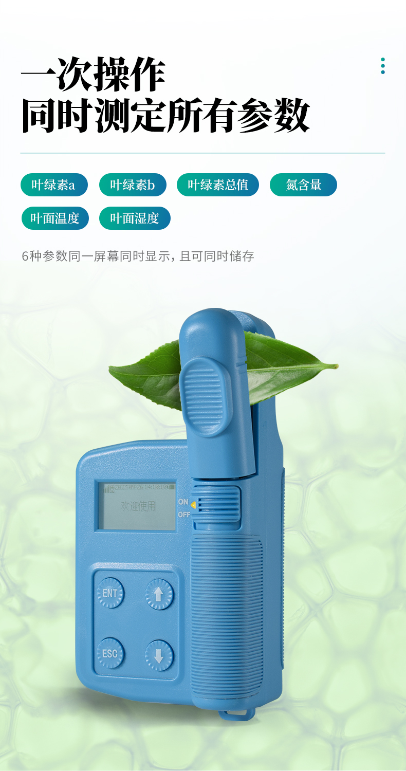 3.一次操作可同時(shí)測(cè)定所有參數(shù),葉綠素a、葉綠素b、葉綠素總值、氮含量、葉面溫度、葉面濕度6種參數(shù)同一屏幕同時(shí)顯示,且可同時(shí)儲(chǔ)存
