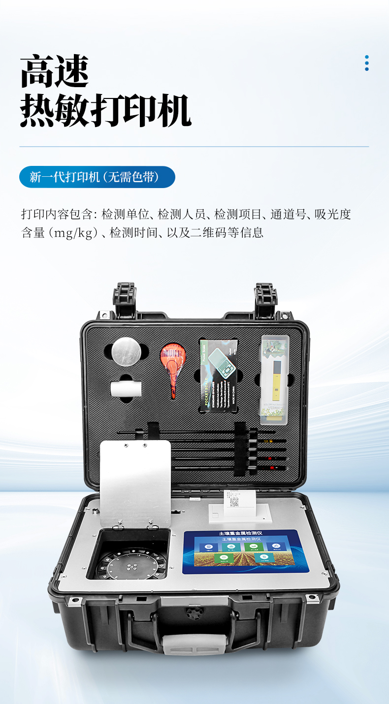 15、內(nèi)置新一代高速熱敏打印機(jī)(無需色帶),打印內(nèi)容包含:檢測單位、檢測人員、檢測項目、通道號、吸光度、養(yǎng)分含量(mg/kg)、檢測時間、以及二維碼等信息