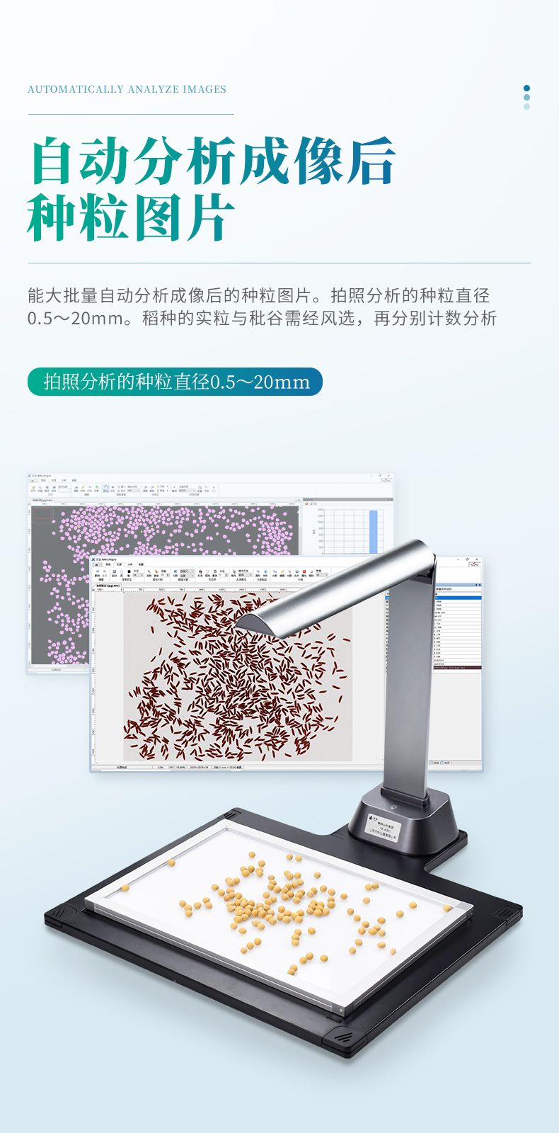 2、成像特性:配自動對焦的1600萬像素分辨率彩色高拍儀,及超薄的背光光源板,具有相機畫面畸變、背光板均勻性的自動矯正特性,有效減小尺寸測量誤差。拍照分析的種粒直徑0.5~20mm。稻種的實粒與秕谷需經(jīng)風選,再分別計數(shù)分析才能得出水稻的結(jié)實率。