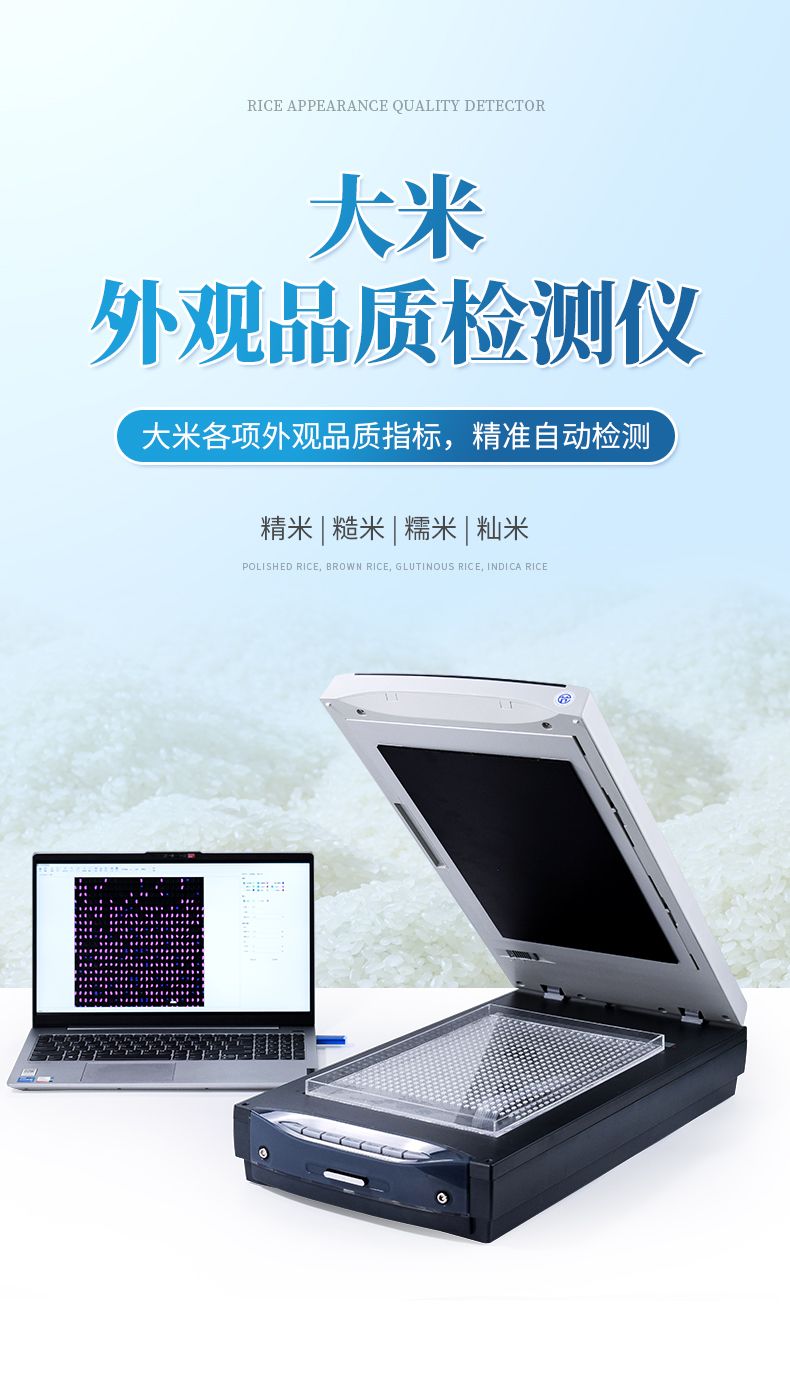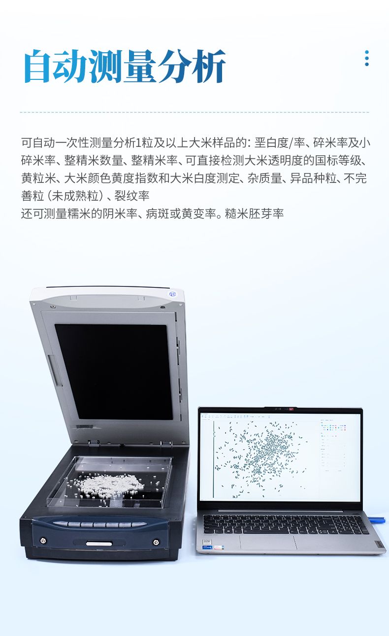 2、★可自動一次性測量分析30g以上大米樣品的:堊白度/率、碎米率及小碎米率、整精米數量、整精米率、可直接檢測大米透明度的國標等級、黃粒米、大米顏色黃度指數和大米白度測定、雜質量、異品種粒、不完善粒(未成熟粒),及糯米的陰米率、病斑或黃變率。還可自動分析大米的裂紋率,糙米胚芽率。