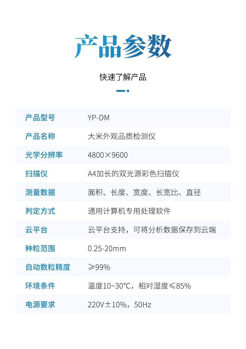 大米外觀品質檢測儀可自動測量每粒的面積、長徑、短徑、長寬比、圓度、等效直徑。可用于各種類大米(精米、糙米、糯米等)各項外觀品質指標的精準自動檢測,可進行多參數、批量化的自動分析