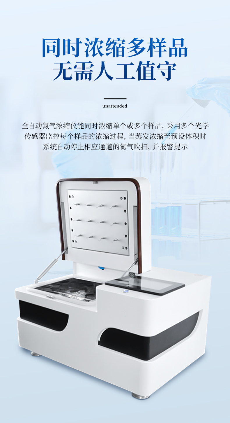 1、全自動氮氣濃縮儀能同時濃縮單個或多個樣品,毋需人工值守:全自動氮氣濃縮儀采用多個光學傳感器監控每個樣品的濃縮過程,當蒸發濃縮至預設體積時,系統自動停止相應通道的氮氣吹掃,并報警提示。整個濃縮過程無需人工看管;