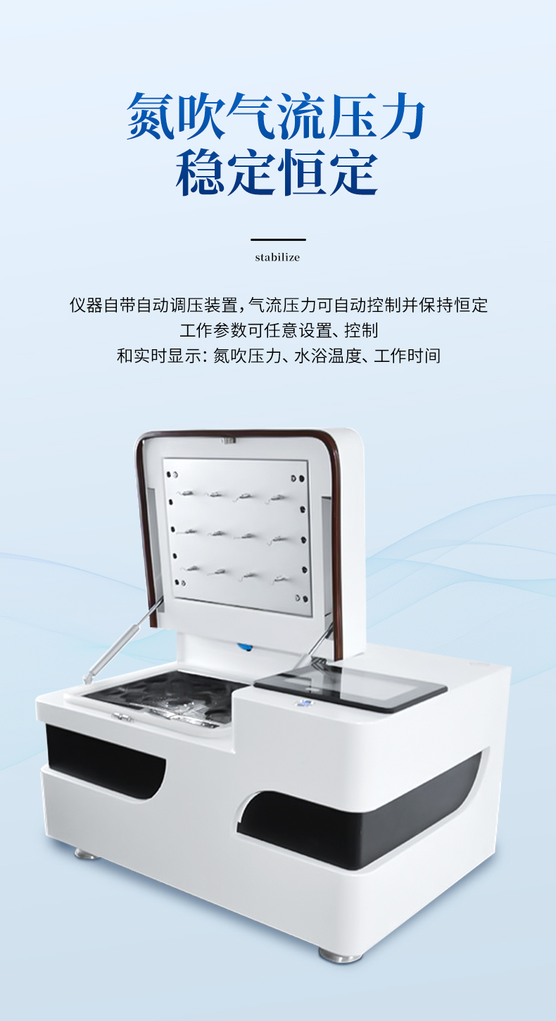 4、氮吹氣流壓力穩定、恒定:儀器自帶自動調壓裝置,氣流壓力可自動控制并保持恒定,不受工作通道(樣品)突然開啟、關閉或數量的影響;