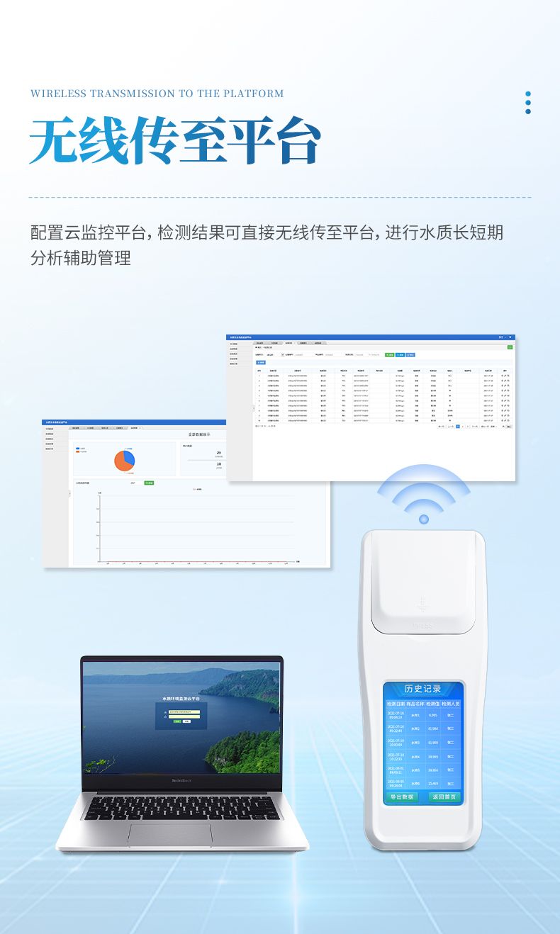 ②配置云監(jiān)控平臺,檢測結(jié)果可直接無線傳至平臺,進行水質(zhì)長短期分析,輔助管理。