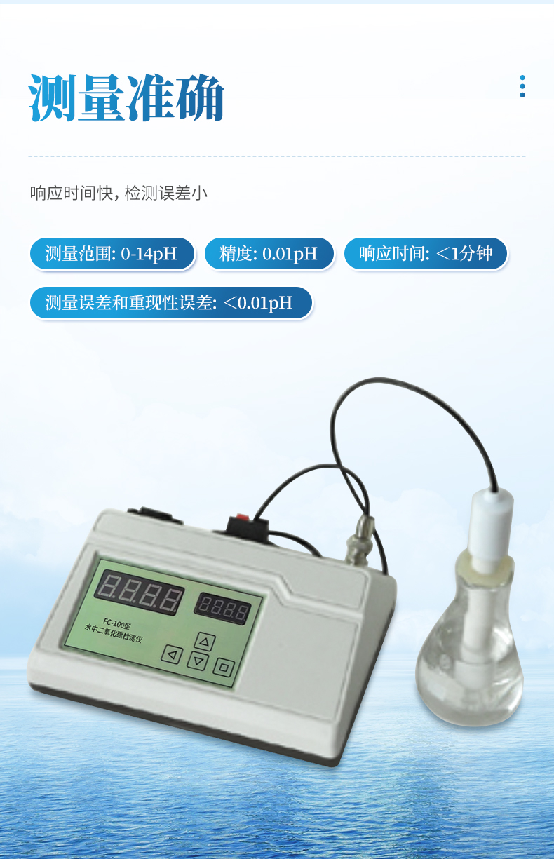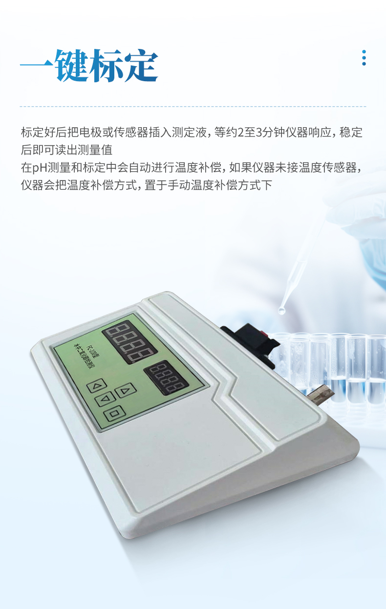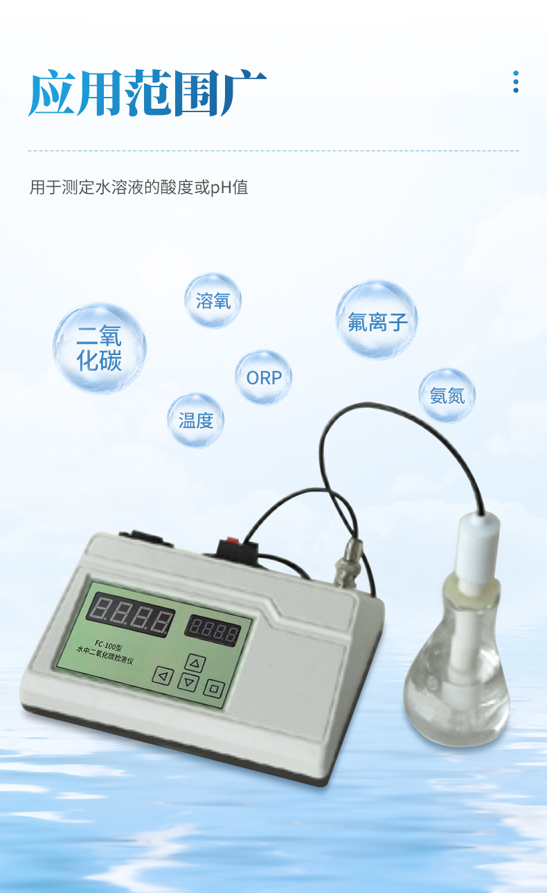 智能化儀器,一鍵標定,LED數顯,測量范圍0-14pH,精度0.01pH。一機多用,除測二氧化碳,還可測二氧化碳,溶氧,溫度,ORP,氨氮,氟離子等濃度等。
