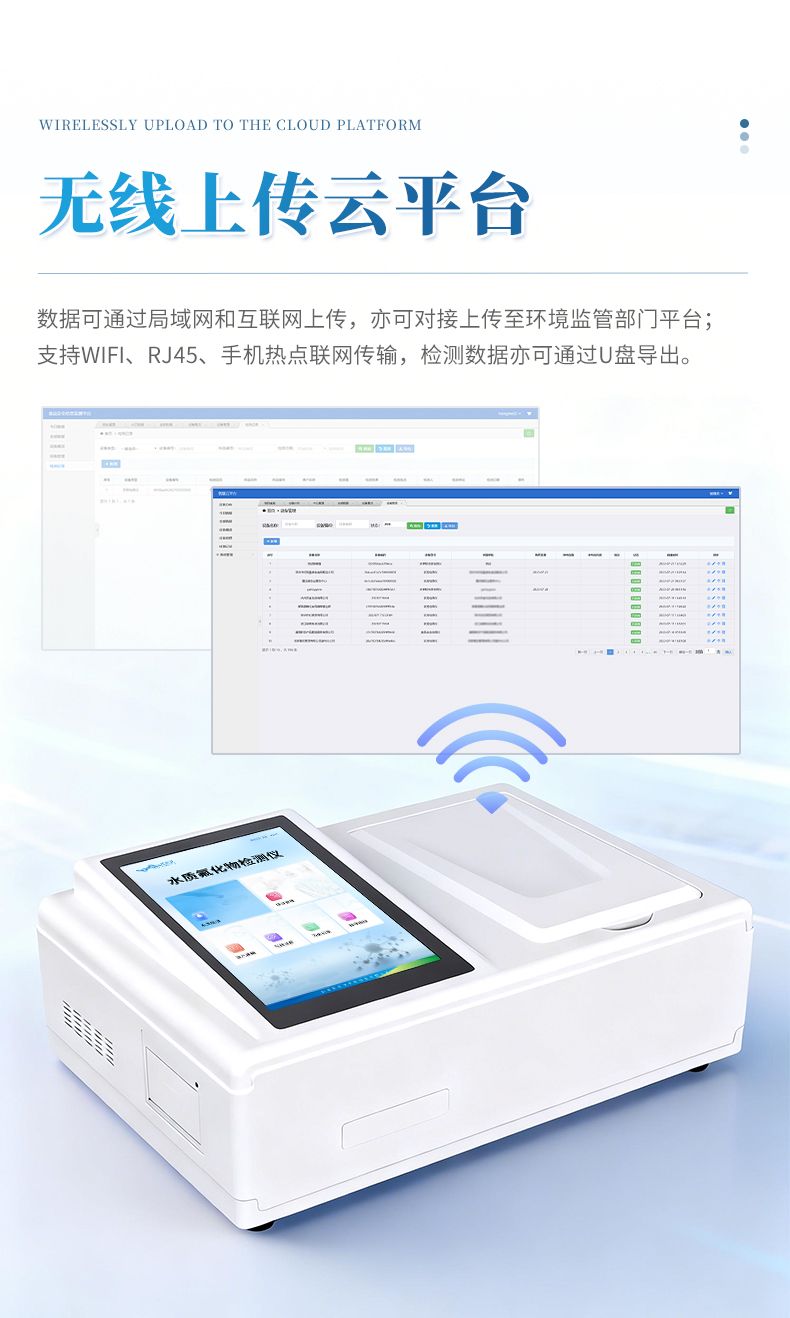 2.配置云監(jiān)控平臺(tái),檢測(cè)結(jié)果可直接無線傳至平臺(tái),進(jìn)行水質(zhì)長(zhǎng)短期分析,輔助管理;