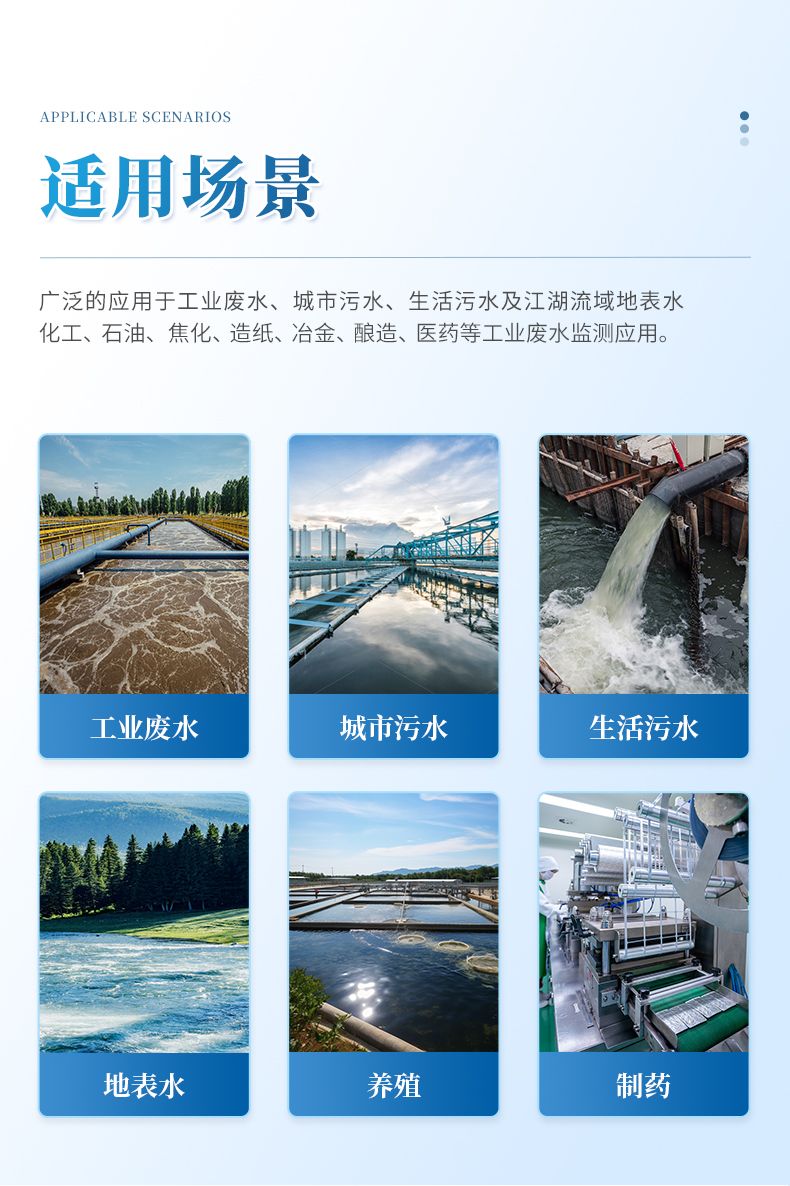 廣泛應用于應急監測、工業廢水、生活污水、污水處理、醫藥化工、食品、飲品、紡織印染、電鍍、造紙、石油冶金、河流治理、科研單位、院校等領域。