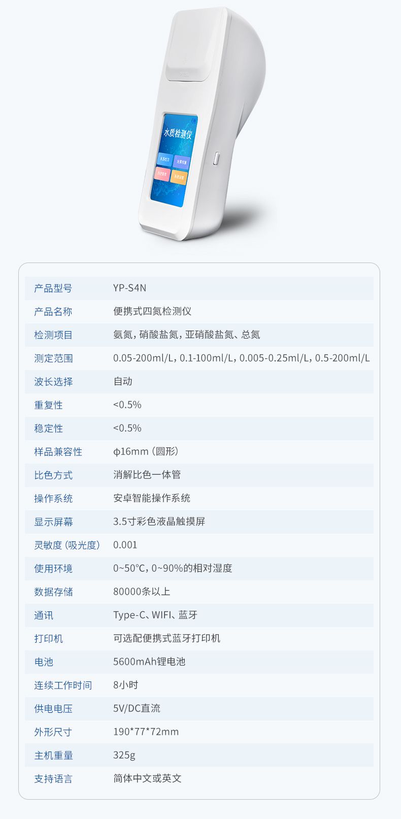 手持式水質四氮檢測儀主要檢測水體中的氨氮、硝酸鹽氮、亞硝酸鹽氮、總氮含量;參考國標以及環境標準研發設計制造,儀器配備高清晰度彩色液晶觸摸顯示屏,Android智能操作系統,中文顯示界面,中英文鍵盤,人性化操作,使用更簡單;