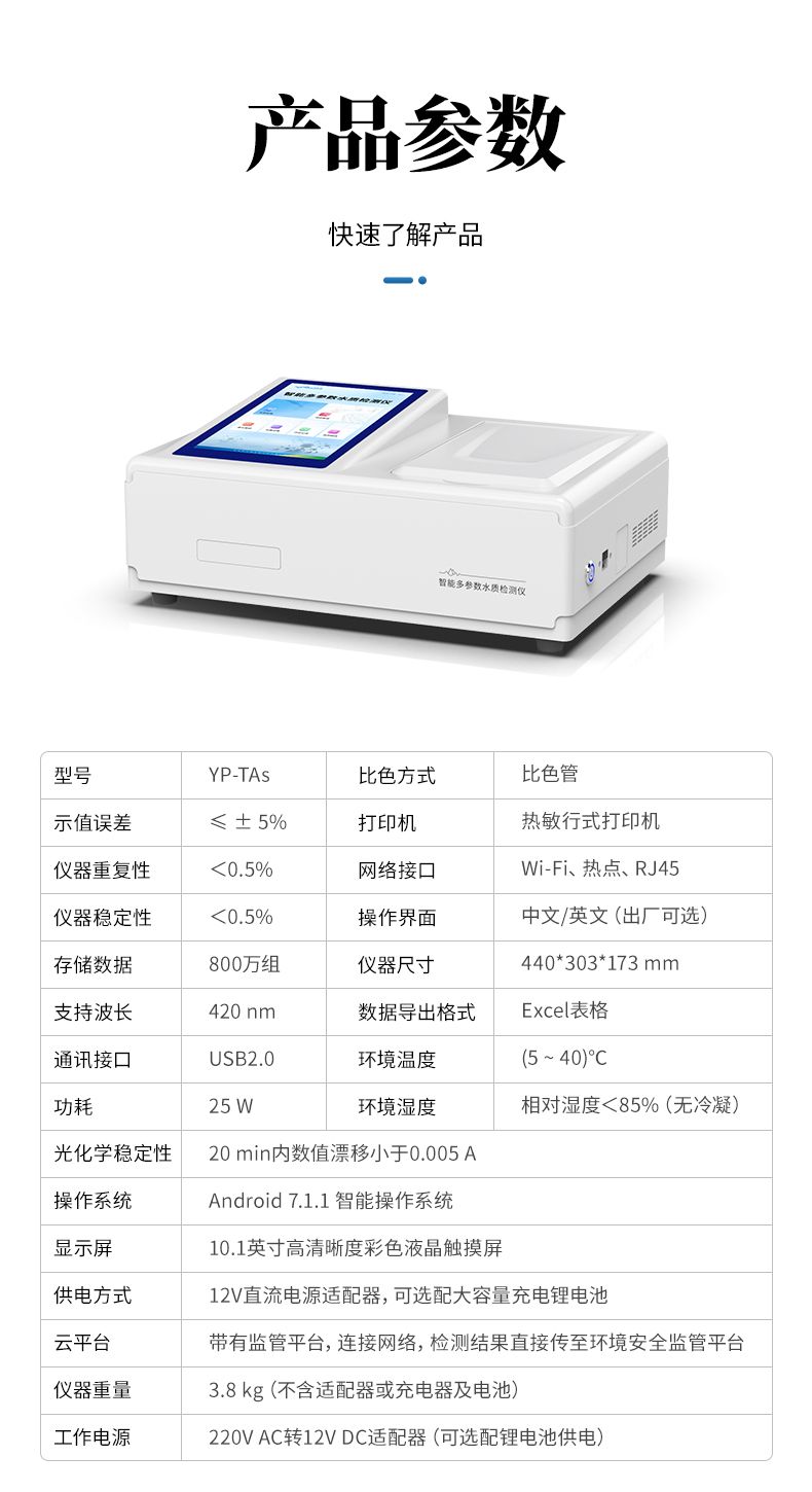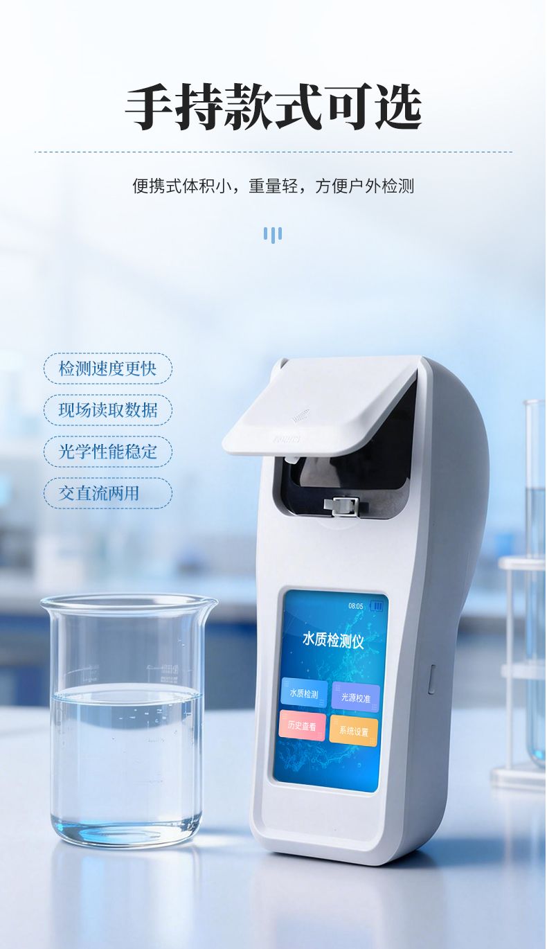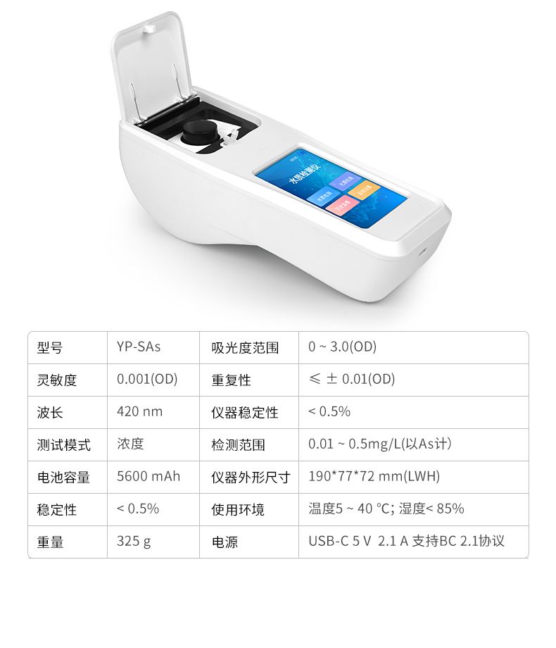 手持式水質砷檢測儀是一款基于分光光度法原理研發的智能化水質總砷檢測儀,專門用于飲用水、地表水、地下水及廢水中總砷的快速定量分析。儀器采用高性能LED光源與大面積光電池,結合優化的硝酸銀-聚乙烯醇吸收顯色體系,確保了在420nm波長下檢測的高靈敏度與穩定性。其搭載的Android智能操作系統,使操作直觀流暢;具備萬條數據存儲、Wi-Fi/藍牙傳輸及防水機身,非常適合實驗室與現場檢測場景。儀器支持多點標定與內置曲線,配合Type-C通用充電與長續航設計,為用戶提供了準確、便捷、可靠的一體化砷檢測解決方案。