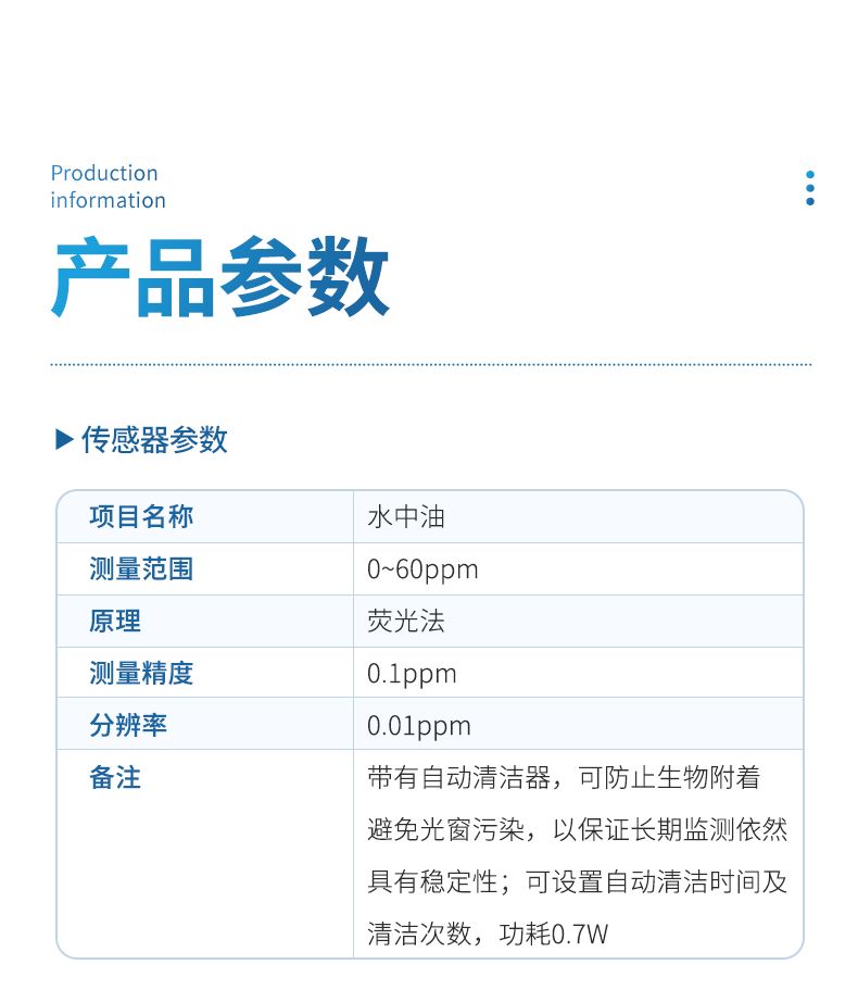 | 15 | cod | 0~500mg/ L | UV254 吸收法 | ±5% | 0.1mg/L | 帶有自動清潔器,可防止生物附著,避免光窗污染,以保證長期監(jiān)測依然具有穩(wěn)定性;可設置自動清潔時間及清潔次數(shù),功耗0.7W | |