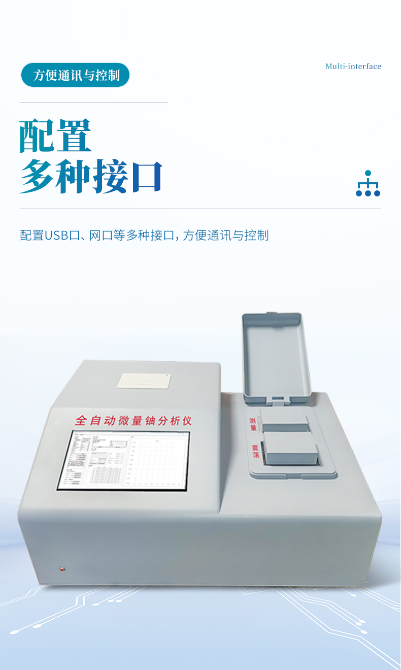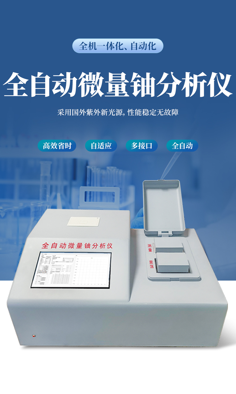為了滿足核工業(yè)、輻射環(huán)保及科學(xué)研究等單位監(jiān)測微量鈾樣品的需要,我公司最新研制成功全自動(dòng)微量鈾分析儀。儀器設(shè)計(jì)采用國外著名公司生產(chǎn)的紫外新光源,該光源的主要特點(diǎn)是性能穩(wěn)定無故障;所用的脈沖光管壽命≥5 年,如用標(biāo)準(zhǔn)加入法能分析8萬個(gè)樣品。電路設(shè)計(jì)采用新型的單片機(jī),測試時(shí)的所有操作只要按中文提示輕輕點(diǎn)擊液晶觸摸屏上的對應(yīng)選項(xiàng),設(shè)備內(nèi)置震蕩功能,避免了外部使用振蕩器的問題,全機(jī)一體化、自動(dòng)化。震蕩完成后可選擇就可用標(biāo)準(zhǔn)加入法、工作曲線法分析樣品。并由單片機(jī)自動(dòng)作出回歸曲線,線性回歸方程式,直接進(jìn)行數(shù)據(jù)處理,液晶屏顯示及打印機(jī)打印能同時(shí)給出樣品測試的最終結(jié)果。該儀器設(shè)有以太網(wǎng)100Base-T4網(wǎng)口。可把測試數(shù)據(jù)直接輸入計(jì)算機(jī),是同類儀器的升級換代產(chǎn)品。