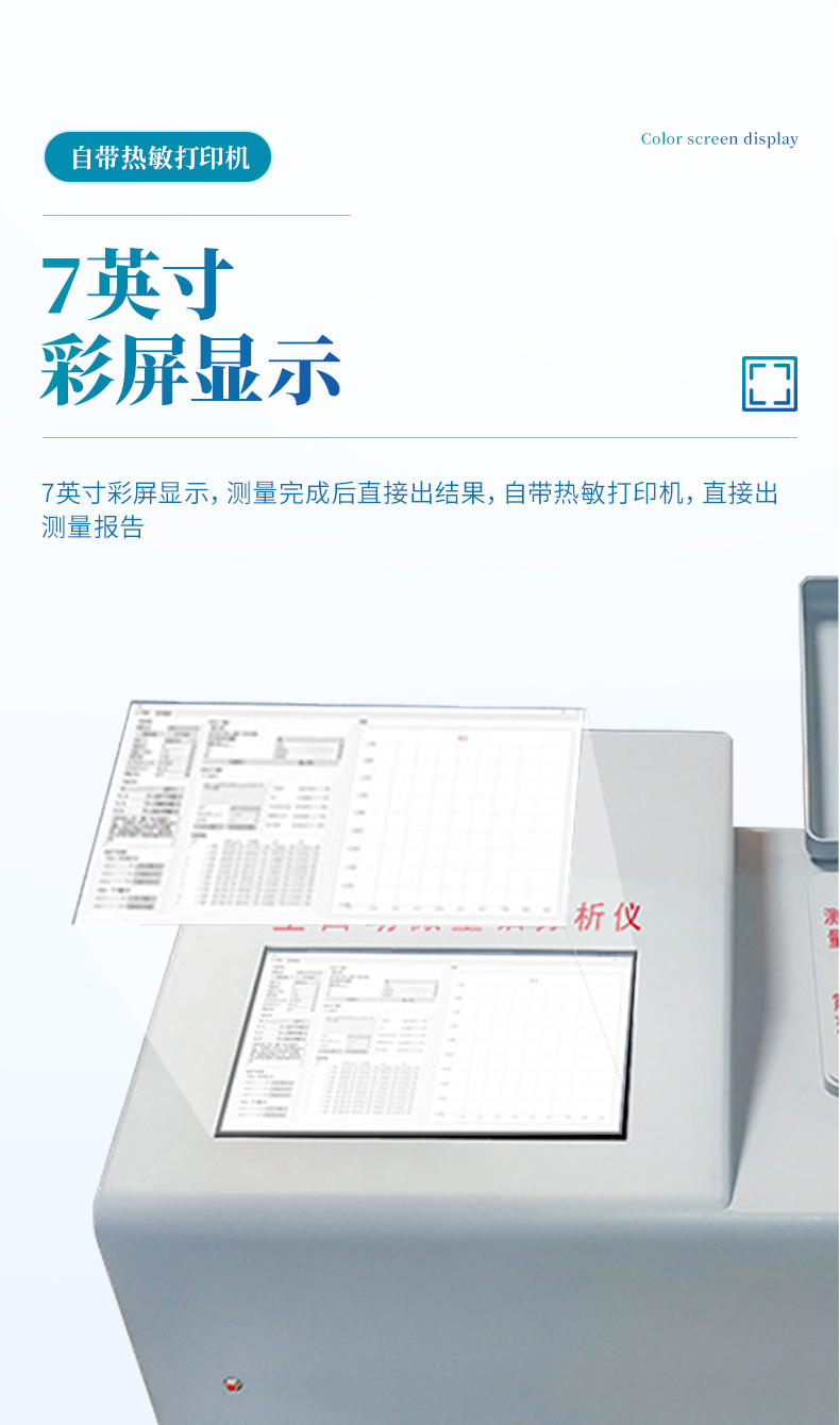 7寸彩屏顯示,測量完成后直接出結(jié)果,自帶熱敏打印機(jī),直接出測量報(bào)告。
