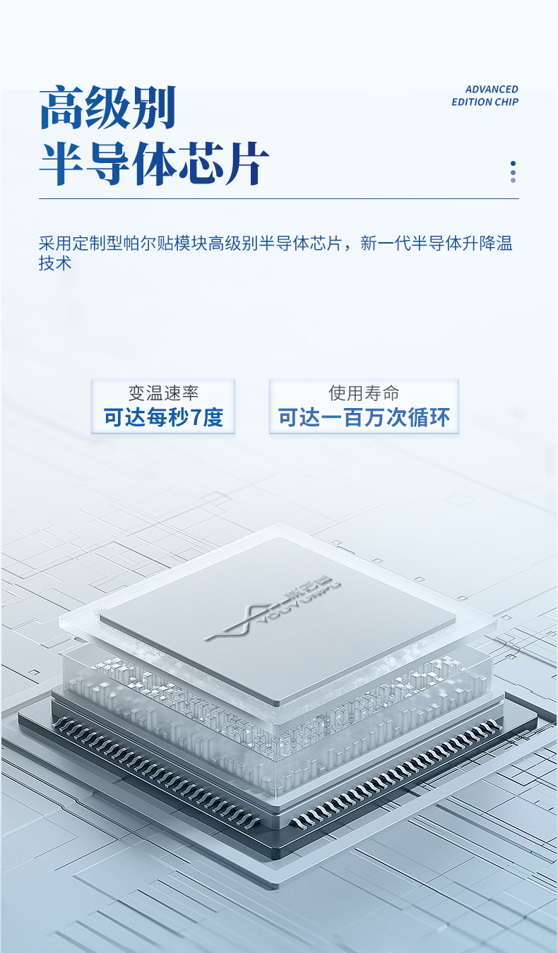 2、采用美國MARLOW定制型帕爾貼模塊高級別半導(dǎo)體芯片,新一代半導(dǎo)體升降溫技術(shù),最快變溫速率可達每秒7度,使用壽命可達一百萬次循環(huán);