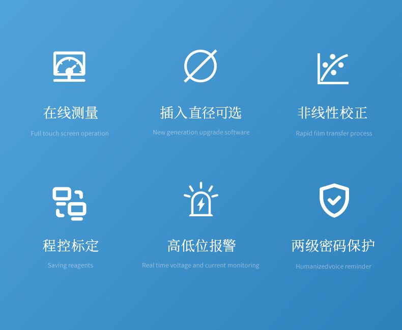 插入直徑可選,各種插入直徑的膜透器有多種插入長度可選。儀器具有非線性校正,程控標(biāo)定,高低位報警,兩級密碼保護(hù)重要數(shù)據(jù)和菜單組態(tài)等功能。