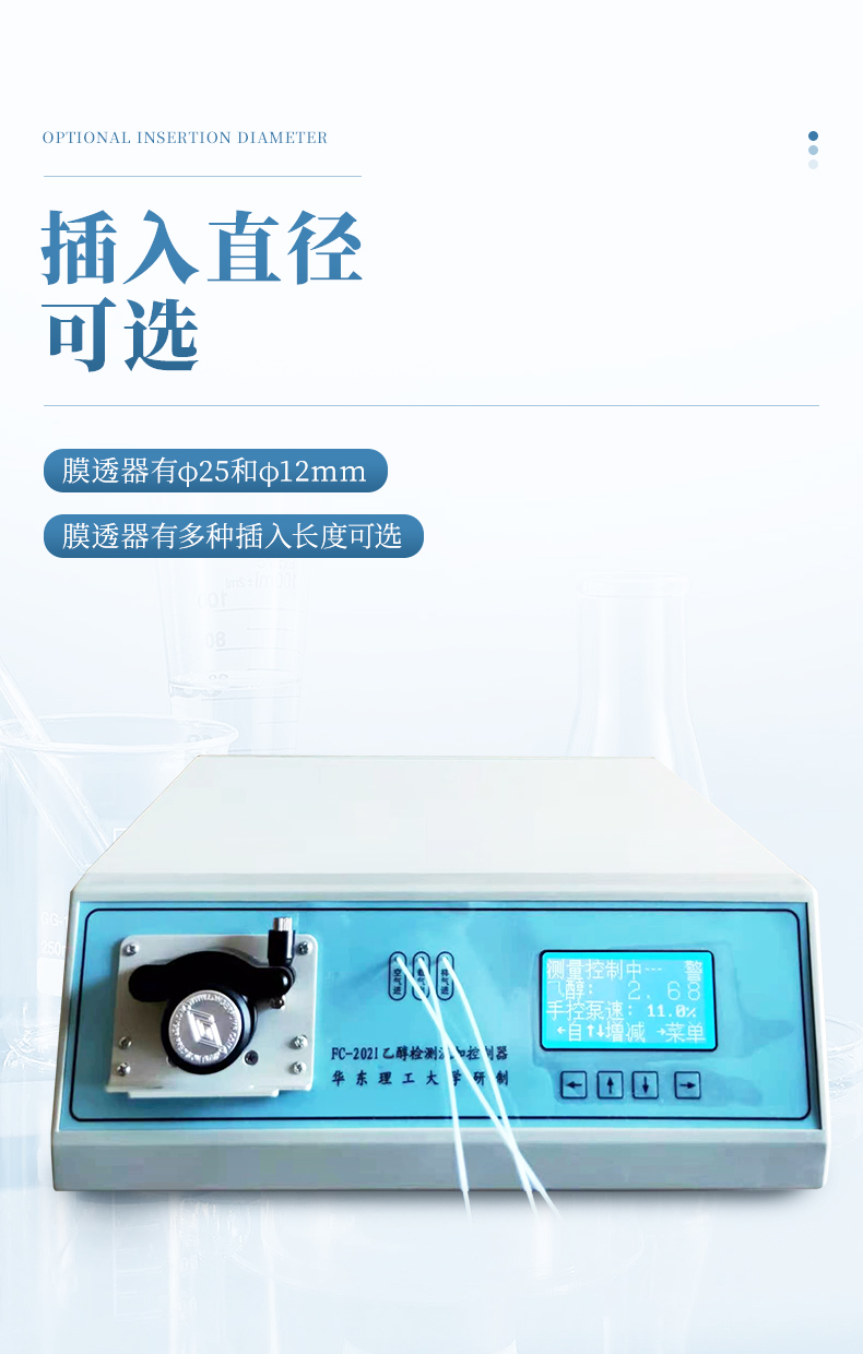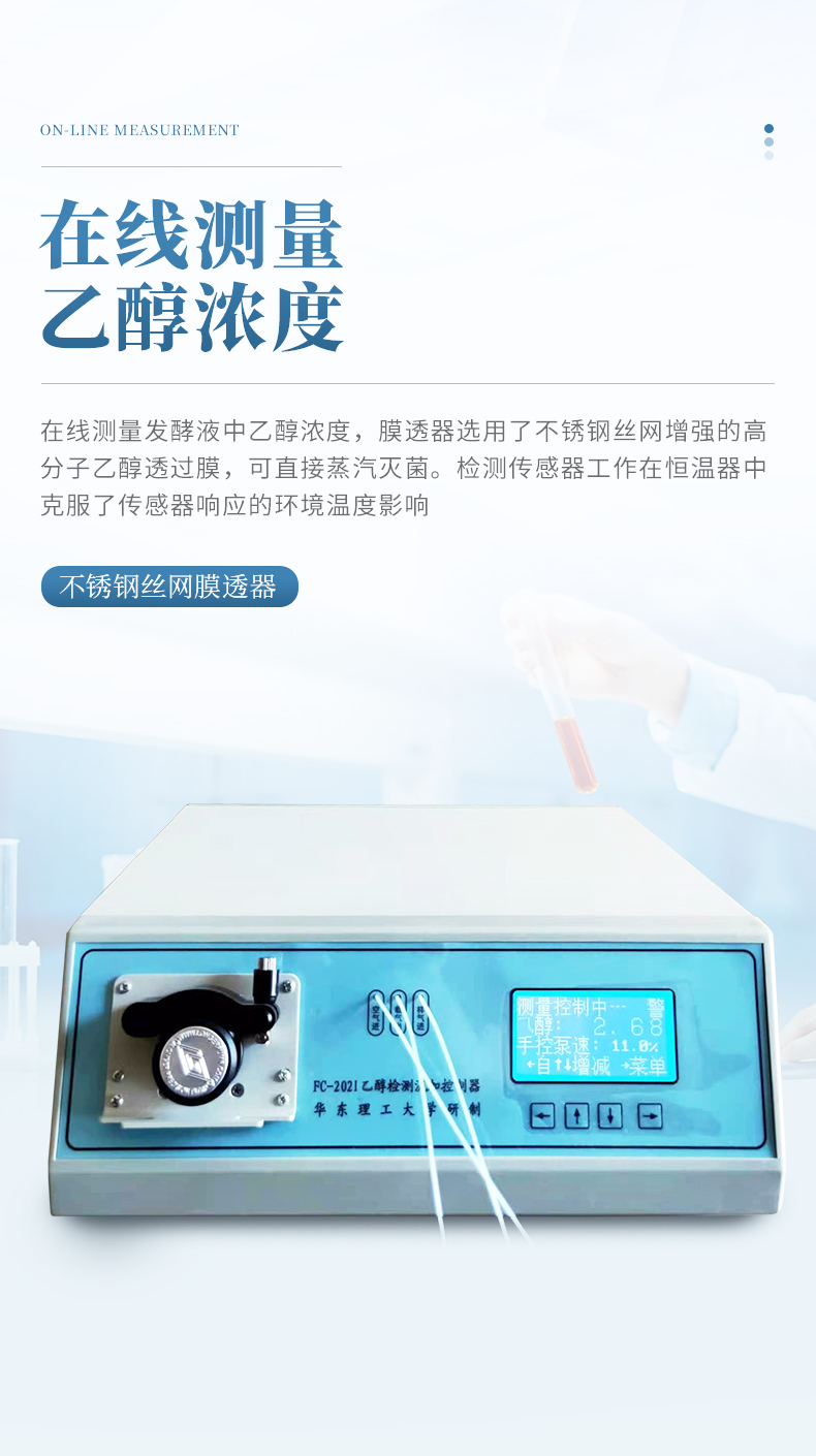 壓縮空氣(載氣)經(jīng)由膜透器流過時,發(fā)酵液中的乙醇透過不銹鋼絲網(wǎng)增強(qiáng)的高分子膜,匯入到載氣流中,并被載氣帶至檢測傳感器轉(zhuǎn)換為電信號,檢測電信號經(jīng)電子線路放大,由機(jī)內(nèi)微型計算機(jī)計算測量結(jié)果,并進(jìn)行PID運(yùn)算,測量值和控制值送至顯示窗顯示,并在兩個模擬信號輸出口輸出4-20mA模擬信號,用于外接記錄儀記錄過程乙醇變化曲線和對料液流加蠕動泵轉(zhuǎn)速進(jìn)行控制,達(dá)到發(fā)酵過程乙醇濃度在線檢測和控制目的。