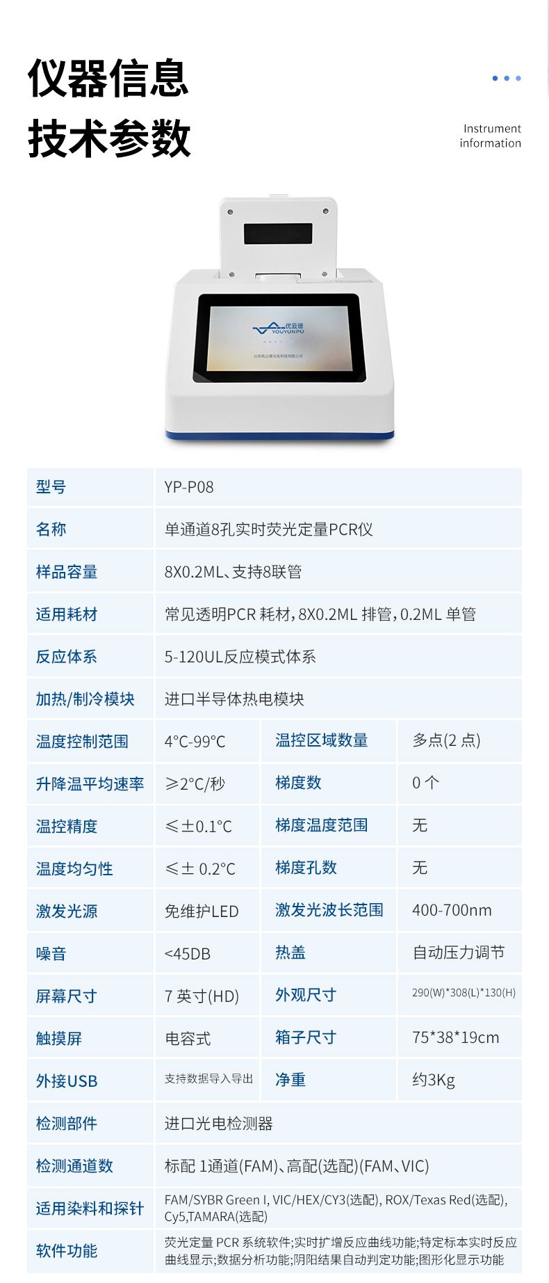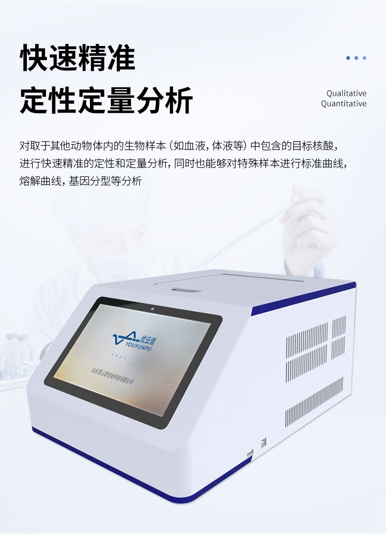 YP-P96型號 實時熒光定量PCR系統主要用于運行實時熒光定量PCR實驗,通過熒光激發和采集的方式,對實驗過程進行實時監控,將實驗過程數據繪制成熒光曲線,實時呈現于儀器顯示界面,并對實驗數據進行擬合和分析,最后可生成PDF格式的實驗報告。