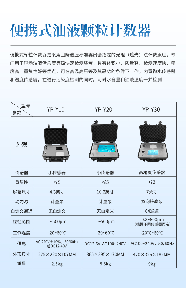 便攜式顆粒計數(shù)器是采用國際液壓標(biāo)準(zhǔn)委員會指定的光阻(遮光)法計數(shù)原理,專門用于現(xiàn)場油液污染度等級快速檢測裝置。具有體積小、質(zhì)量輕、檢測速度快、精度高、重復(fù)性好等優(yōu)點,可在高溫高壓等及其惡劣的條件下工作。內(nèi)置微水傳感器和溫度傳感器,在進(jìn)行污染度檢測的同時,可對水含量和油液溫度一并檢測。適用于發(fā)動機(jī)油、齒輪油、變壓器油(即絕緣油)、液壓油、潤滑油、合成油等油液,可廣泛應(yīng)用于電力電廠、航空航天、石油化工、交通港口、鋼鐵冶金、汽車制造等領(lǐng)域。