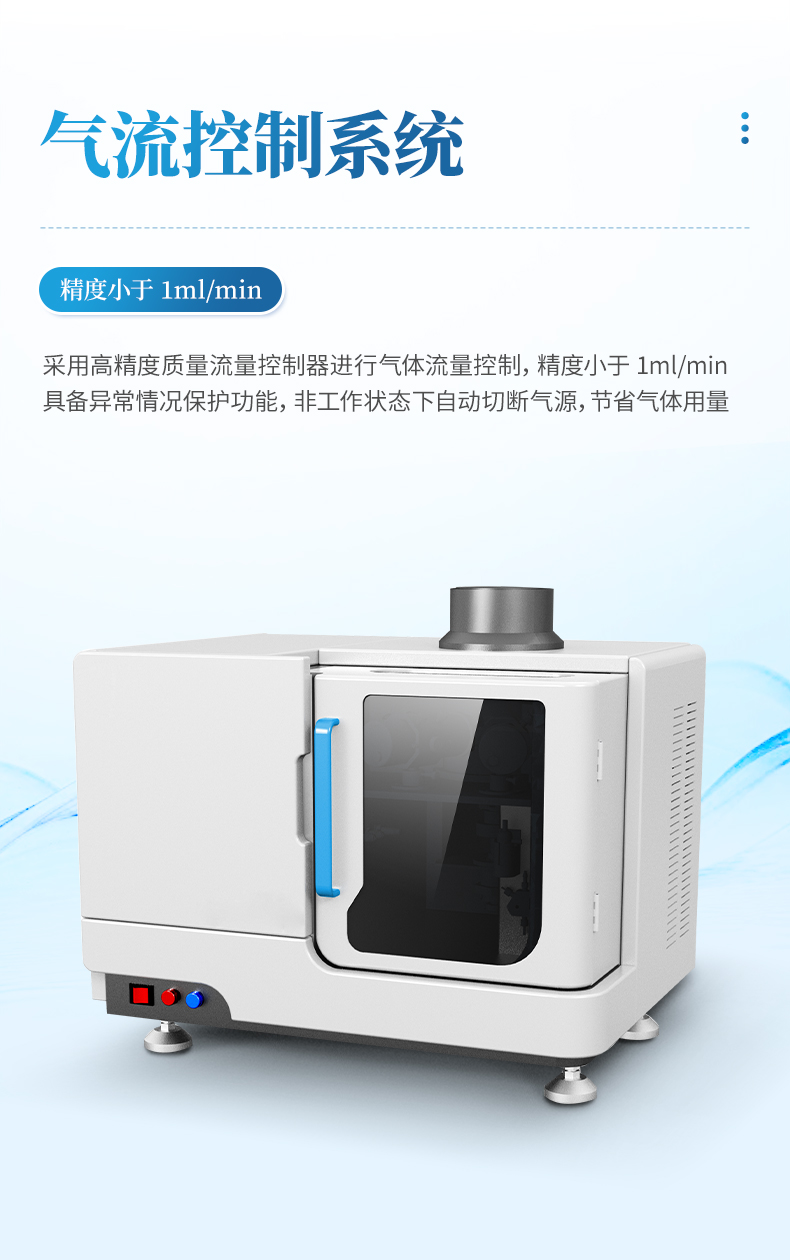儀器采用高精度質量流量控制器進行氣體流量控制,精度小于 1ml/min。同時具備異常情況保護功能,儀器非工作狀態(tài)下自動切斷氣源,節(jié)省氣體用量。