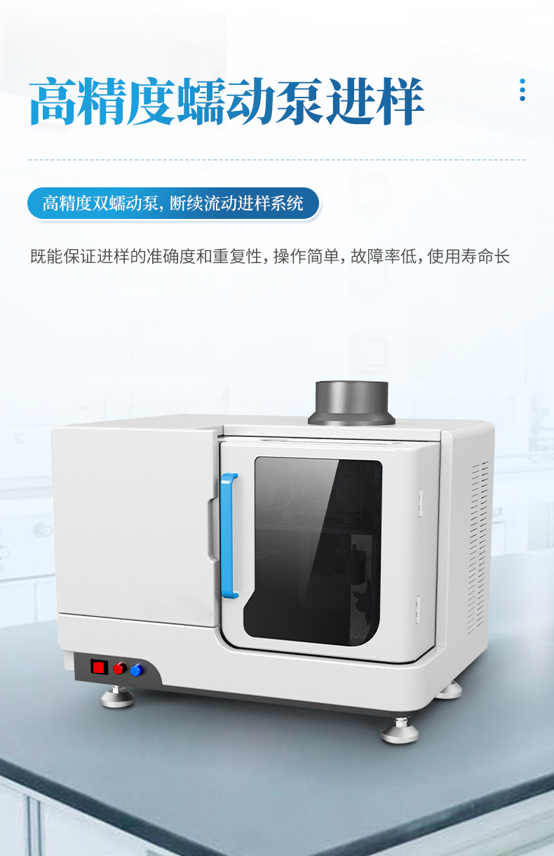 采用高精度雙蠕動泵斷續(xù)流動進樣系統(tǒng),既能保證進樣的準確度和重復性,操作簡單,故障率低,使用壽命長。