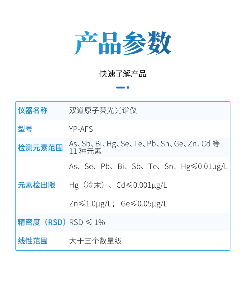 雙道原子熒光光譜儀廣泛應用于汞(Hg)、砷(As)、銻(Sb)、鉍(Bi)、硒(Se)、碲(Te)、鎘(Cd)、鍺(Ge)、鉛(Pb)、錫(Sn)、鋅(Zn)等11 種元素的痕量、超痕量分析,體積小巧,性能穩(wěn)定,操作簡單。
