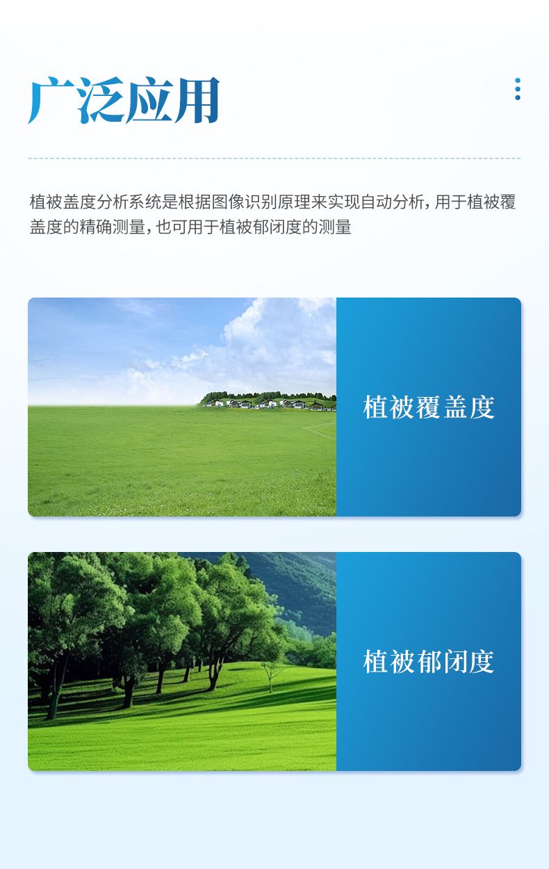 植被蓋度分析系統根據圖像識別原理來實現自動分析,用于植被覆蓋度和郁閉度的精確測量。儀器具有良好的防水性能,并帶有太陽能供電系統,可在戶外環境下長期自動定時采集分析,獲取植被長期生長變化情況。