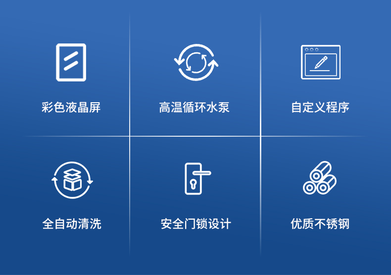 1.1全自動清洗設備,利用高溫、高壓水持續噴淋器皿內外表面,結合清洗液的作用,清潔器皿內外污物,進水、清洗、排水、烘干全自動完成,無需人工干預;