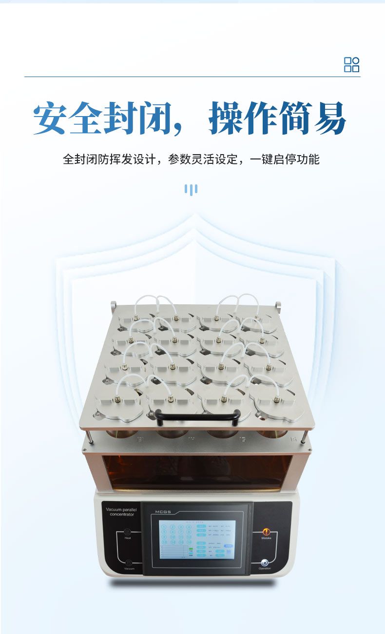 真空平行濃縮儀可對多個樣品進行單獨或者集中密閉蒸發/濃縮,快速有效的回收溶劑,降低了多個樣品的總蒸發時間,增加了處理量,節省了操作實驗時間和實驗資源,平行蒸發儀安裝操作簡單、使用靈活。由于處理條件高度一致,因此平行性也更好。平行蒸發儀主要用于化工、醫藥、生物、環保、檢測或其它行業中樣品的蒸發濃縮。