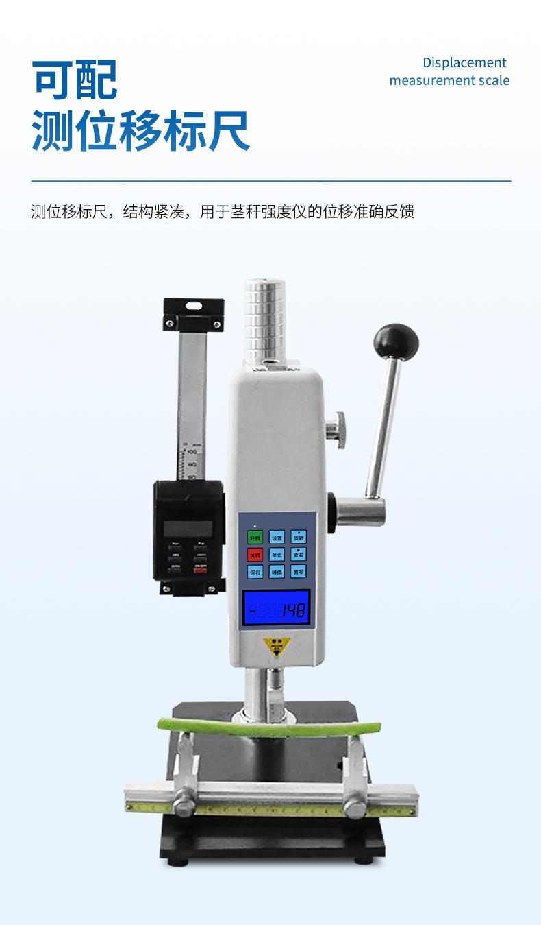 植物莖稈的強度是決定作物抗倒伏能力的一個主要因素,長期以來玉米,高梁、煙草等的倒伏給作物的機械收割造成很大的困難。從機械化水平來說,造成大量的糧食浪費。另外,作物倒伏導致光照不充分,使其生產量受到極大的限制。在作物生長的各個階段對其莖稈進行活體測量,進而根據莖桿纖維層的抗彎阻力與抗倒伏能力的相關性對群體測量數據進行統計處理,對作物的栽培和育種具有重要意義。植物莖稈強度儀采用拉壓力傳感器,通過針刺、壓碎、折斷的方式測出莖稈斷裂或者屈服瞬間產生的最大力,即莖稈的強度