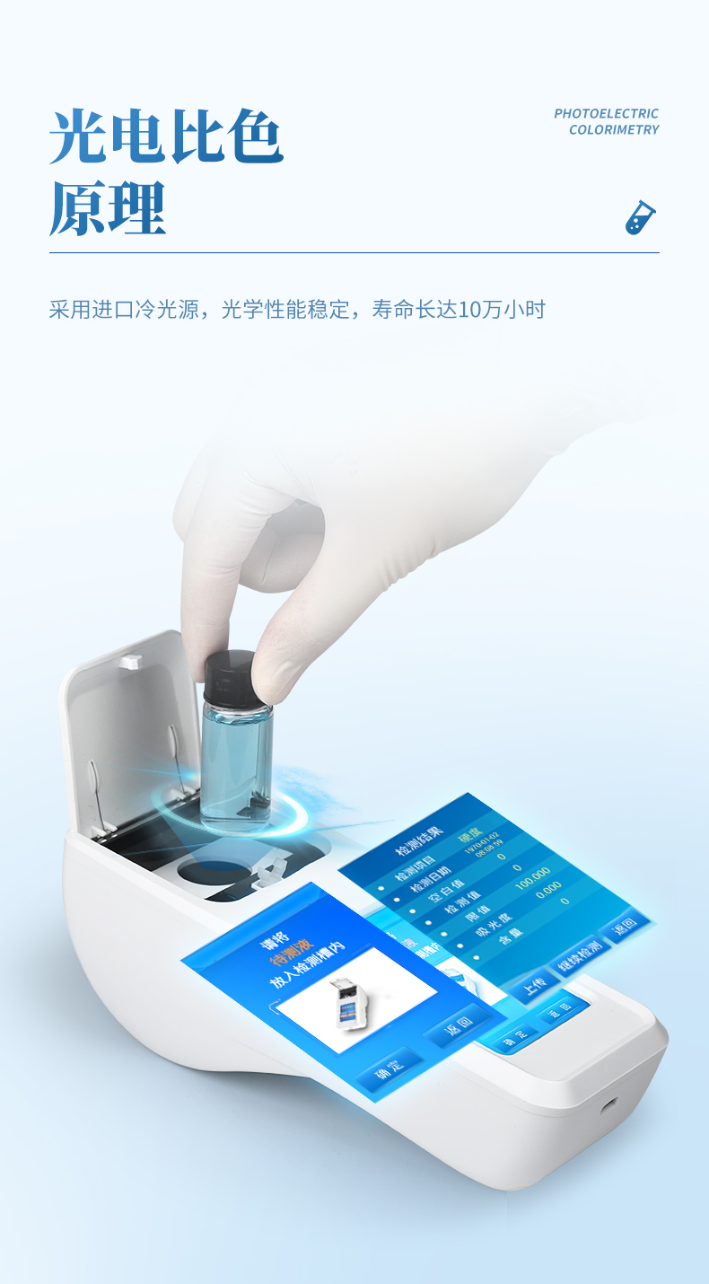 水質(zhì)總硬度檢測儀可簡單快速測試水質(zhì)中總硬度濃度值。利用比色法原理配合總硬度檢測試劑快速準(zhǔn)確測試水中總硬度含量。